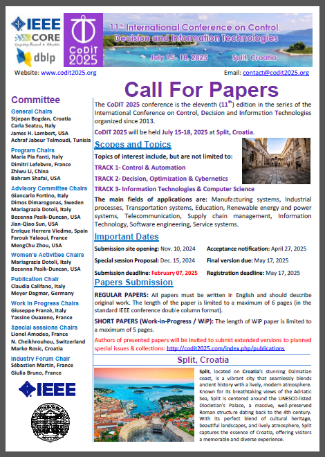 Papers will be refereed through a blind process for technical merit and content. To be eligible for publication in the Conference proceedings, an accepted paper must be presented at the Conference by one of the authors. You can send your work as a regular paper or send it to one of the accepted special sessions. Papers should be submitted before March 15, 2025.